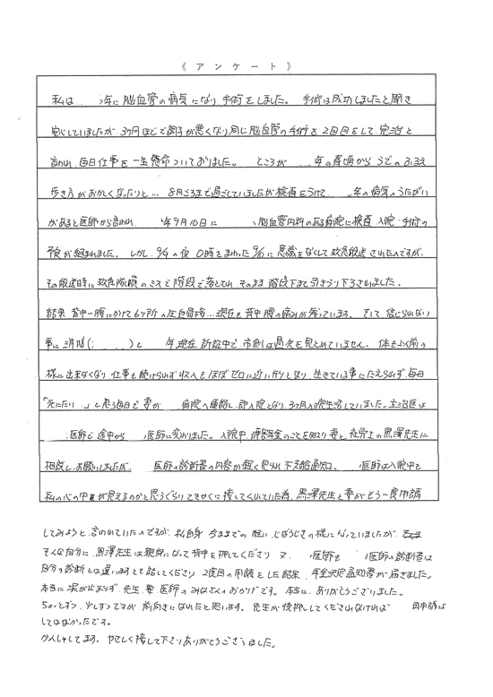 今後、主人の状態の変化や更新等がある際には、また浅賀先生にお願い出来たらと思っております。主人よりもくれぐれも宜しく伝えて欲しいと言われております。