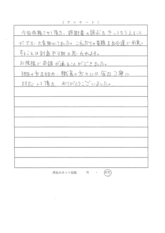 今回依頼させて頂き、診断書の請求もやってもらえることができ、大変助かりました。これだけの書類を自分達で用意することは到底不可能と思われます。
